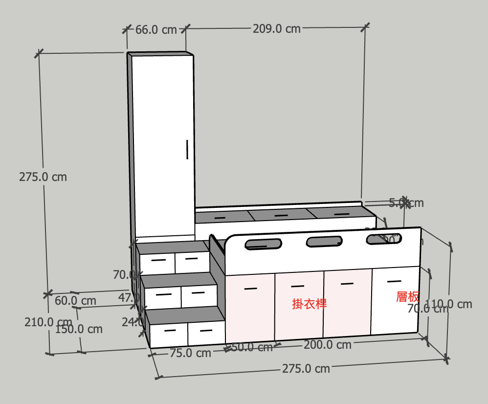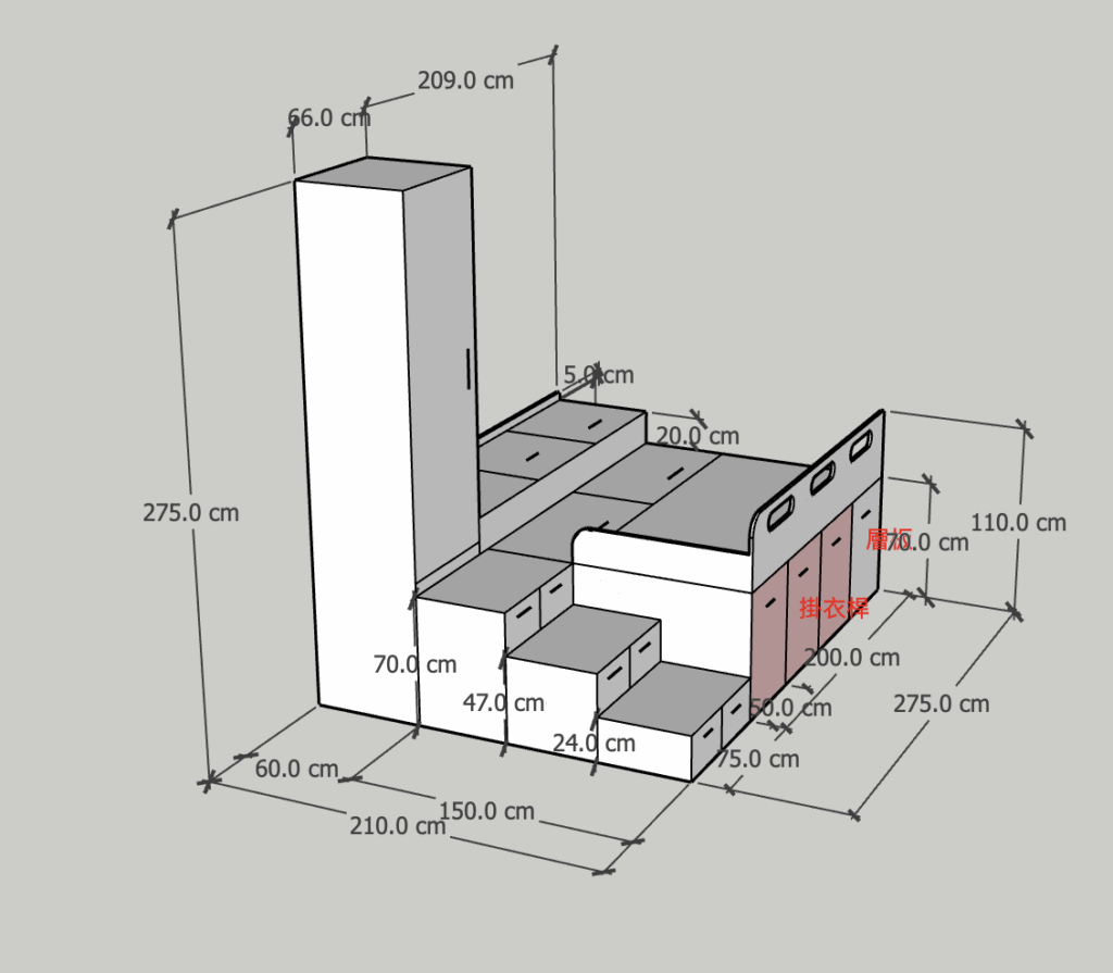 最後我們採用「階梯式掀床整合衣櫃設計」,