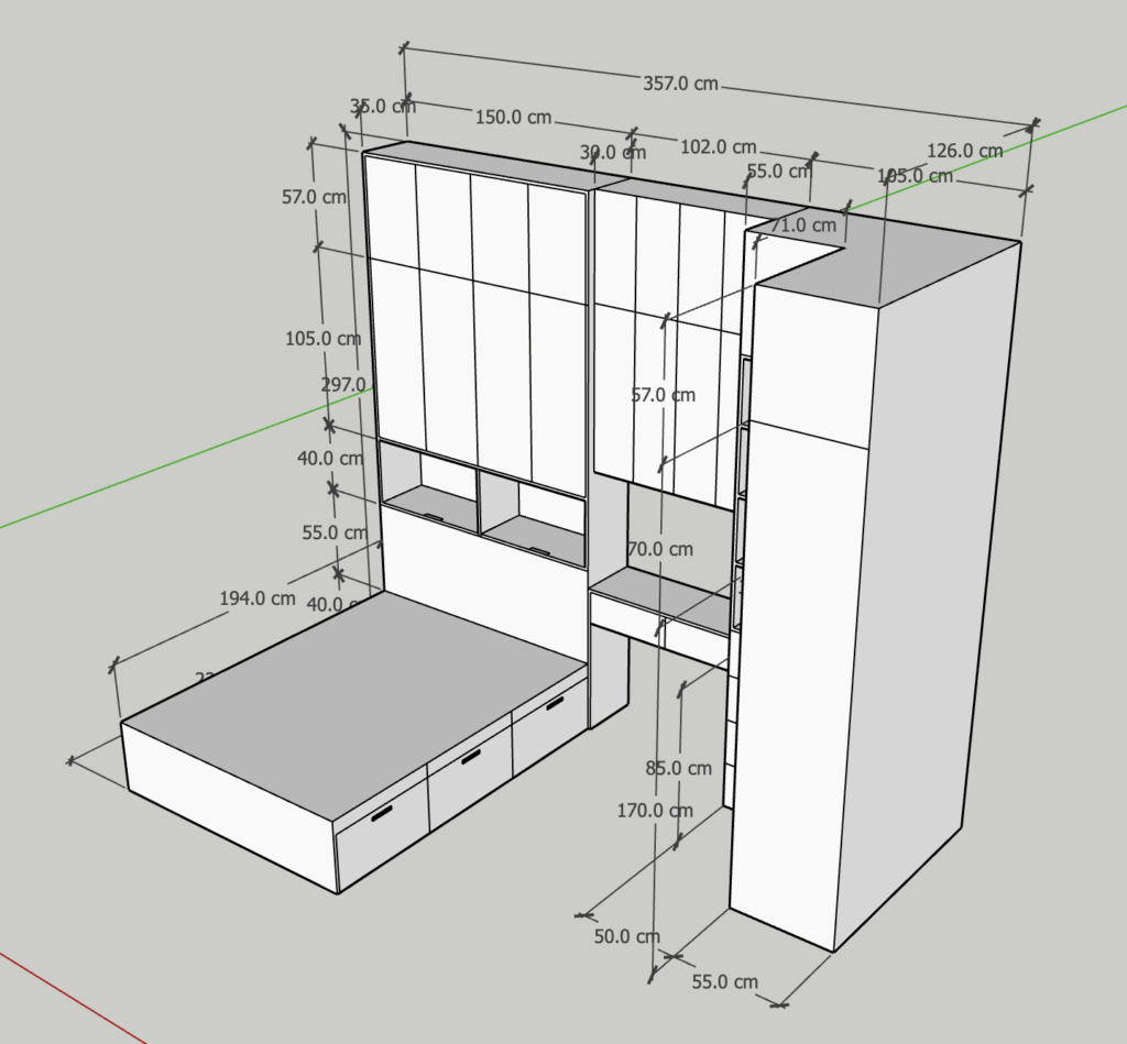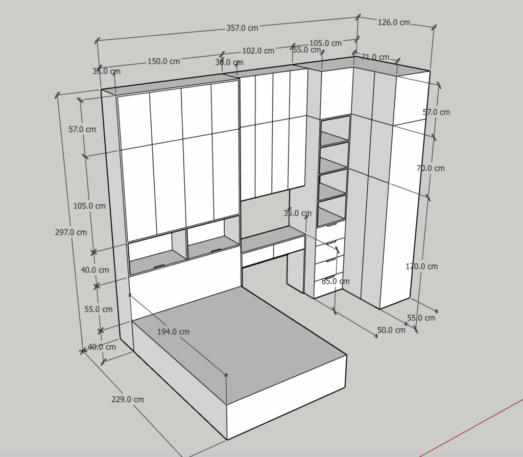 - 總深度估算:床長 229 cm + 牆後櫃體深約 55 cm ≈ 284 cm(= 2.84 m)