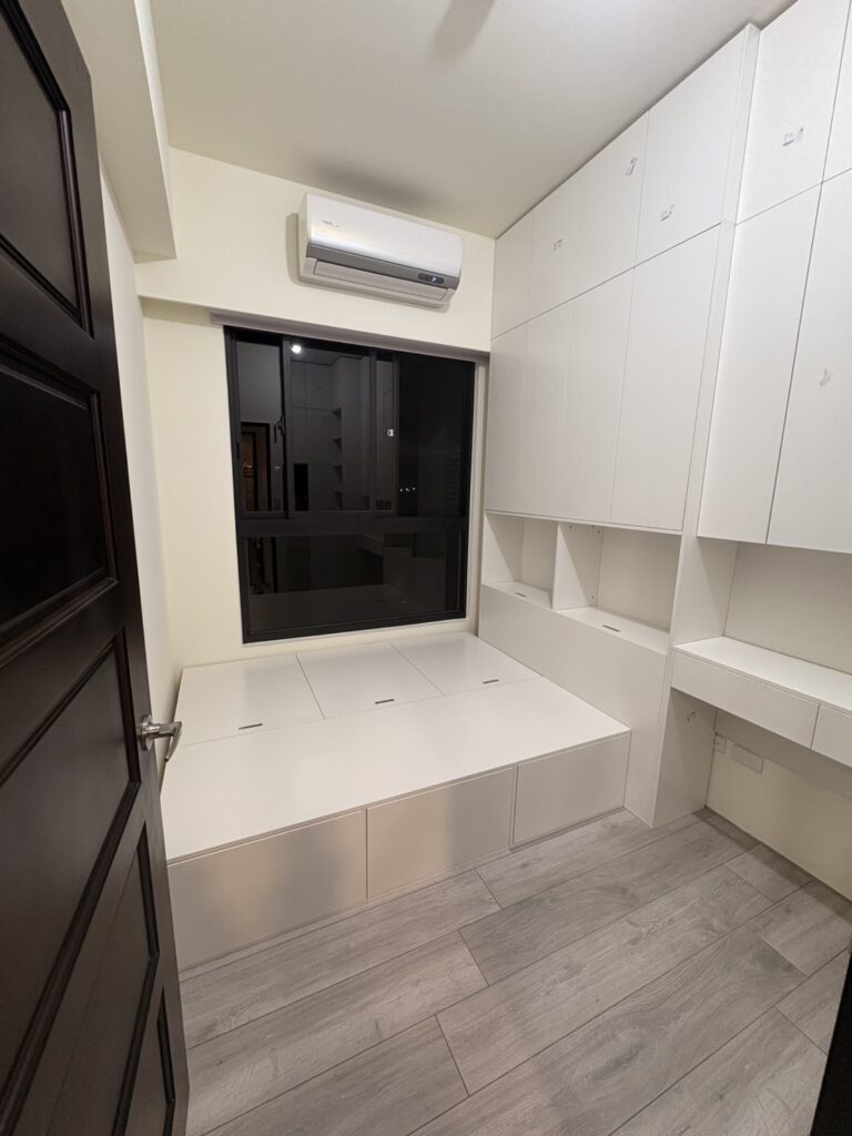 - 採光:主窗在床側,櫃面全白+低反射地板,把光線推到最裡面。