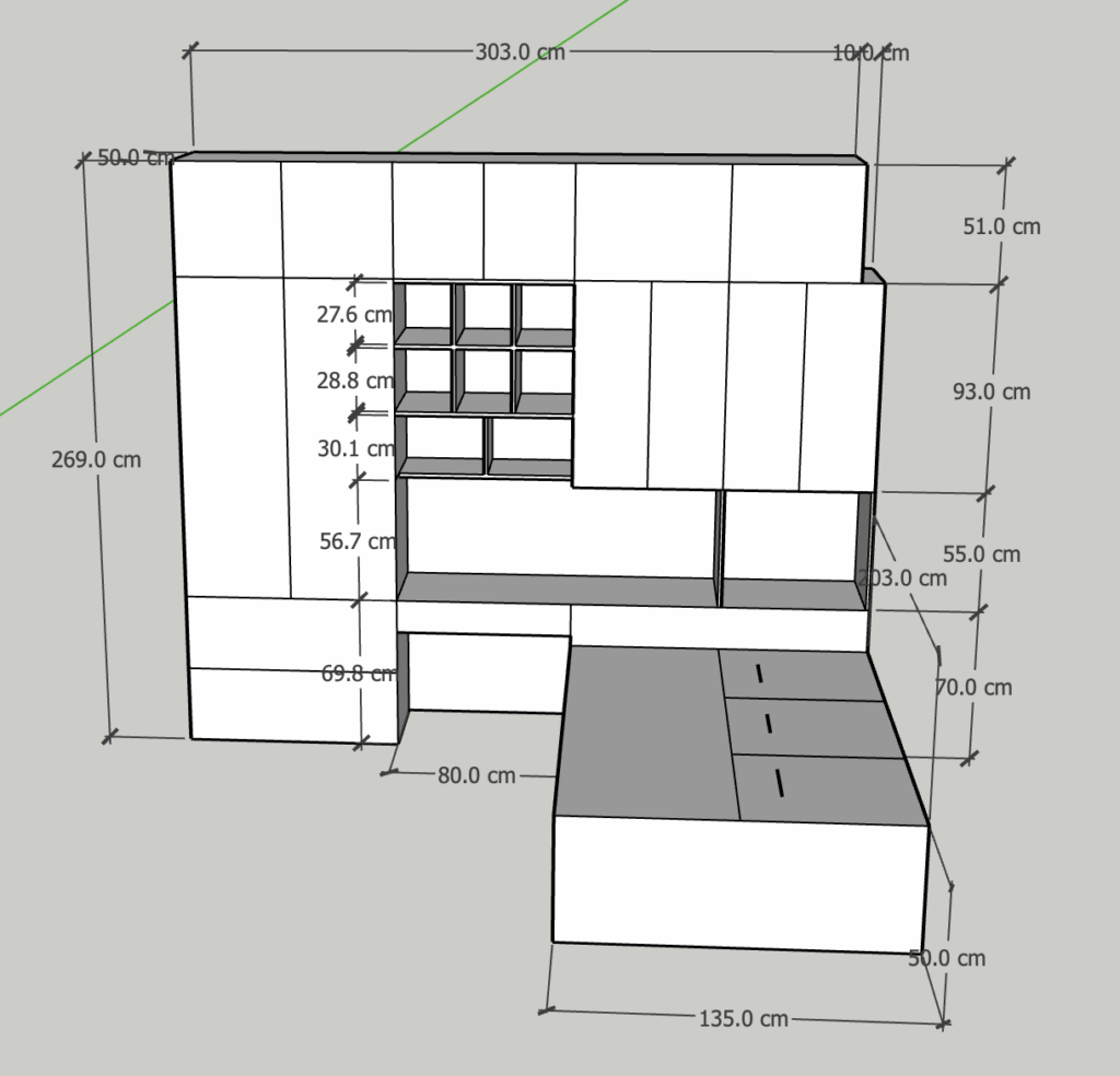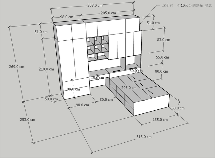 | 上櫃 | 連接全牆,擴大儲物空間 | 寬 303cm × 高 83cm |