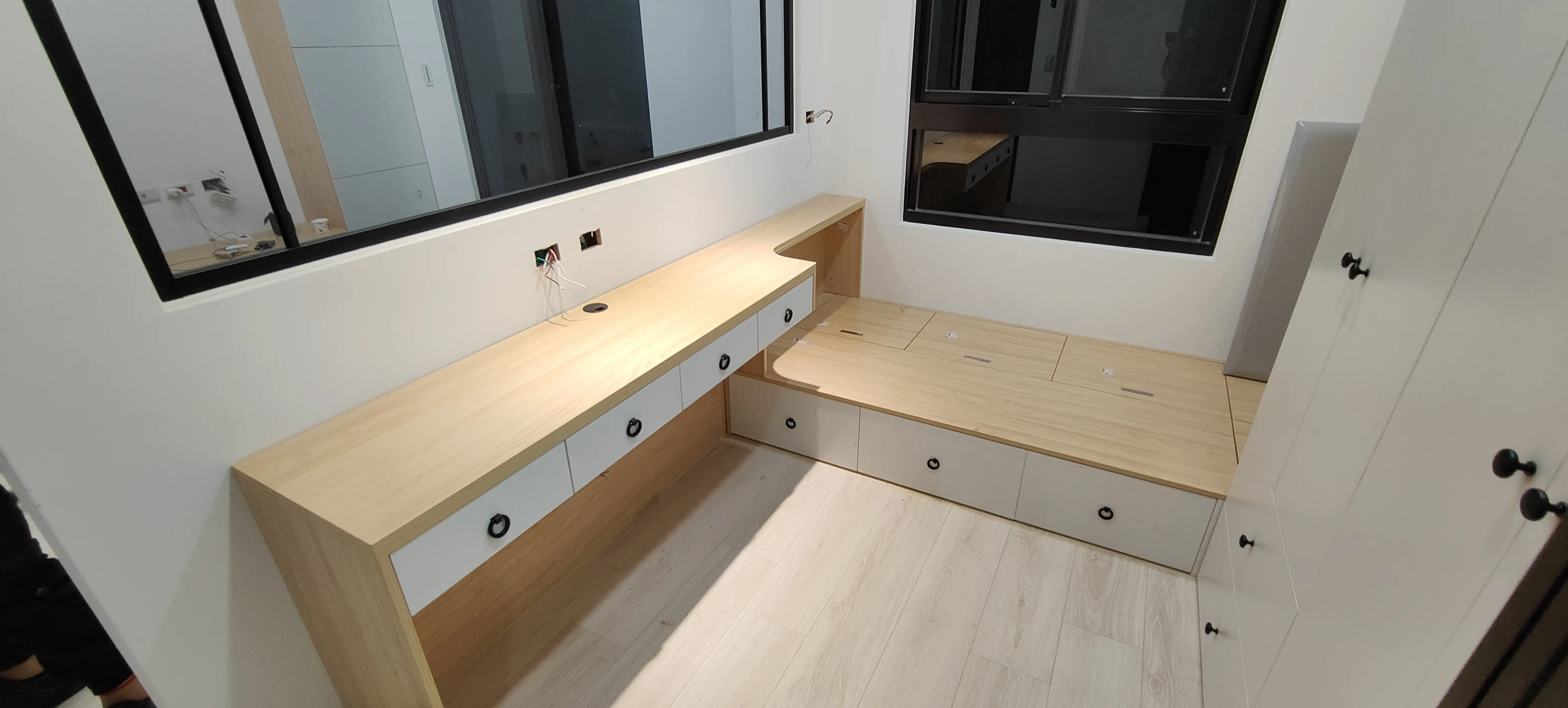 看似很像,但其實做法完全不一樣,若要追求櫃體和牆壁之間沒有任何一點縫隙,可以木工優先。若想要工程快沒粉塵和價格實惠又能做到木材包邊美麗,可以選擇客製化家具,二者之間還是有不同工法、優缺點,建議事先了解自己追求的方向再決定,才不會事後預期不同造成不好的經驗。