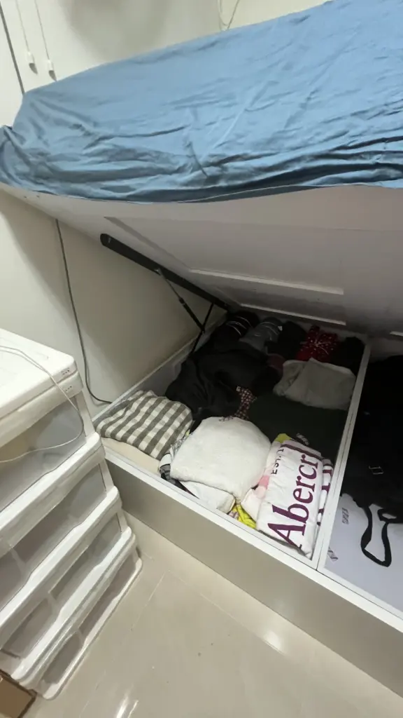 整張床板掀起就是一大空間,行李箱、被褥都能放。視覺簡潔,但小物收取不方便,建議搭配收納盒。