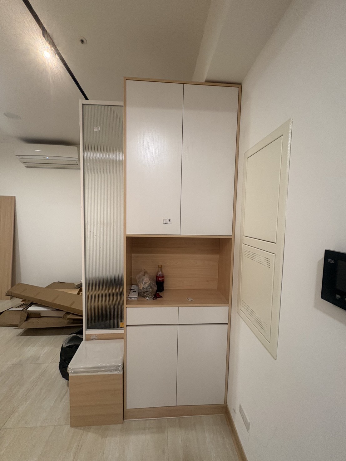 這次屋主的需求很單純:「我要一個能藏鞋、能坐、能隔開視覺的空間。」