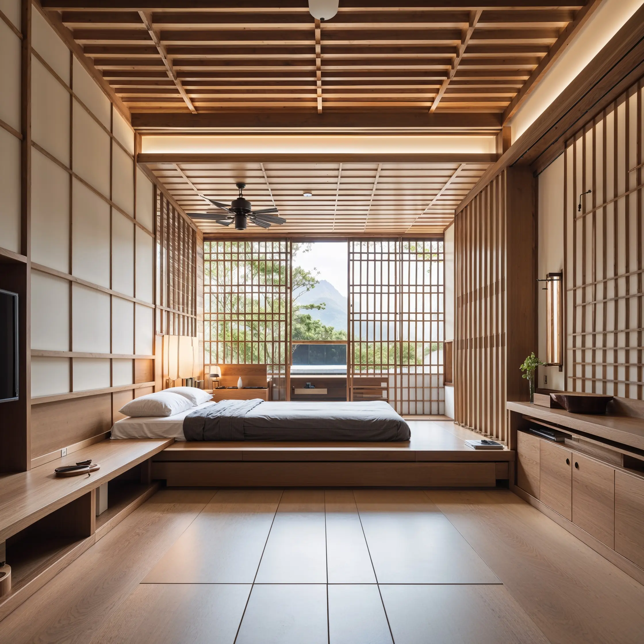日式設計重視水平線條,例如矮櫃、地台、格柵橫條。這種配置能使空間視覺拉寬,產生穩定的心理感受。